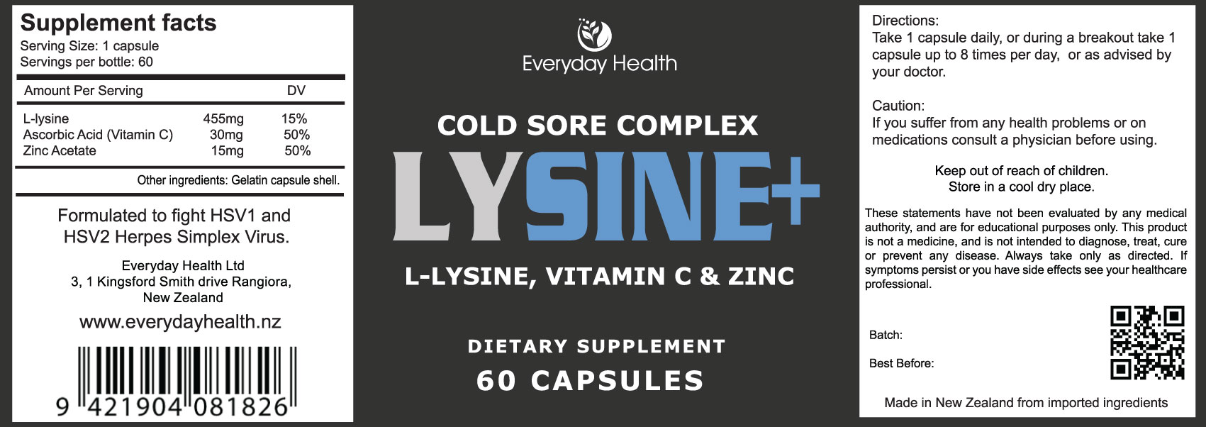 Lysine Cold Sore Complex, is a virus busting formula that targets the herpes simplex virus: HSV1 (oral herpes) and HSV2 (genital herpes). It could also be effective against other strains of HSV and other viruses in general.